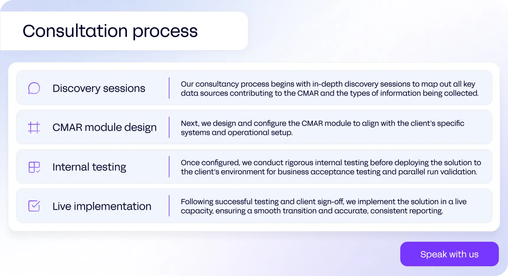With Aurum, you can create a fully audited and accurate CMAR report in minutes, saving time and sidestepping the manual effort needed to stay CASS compliant.